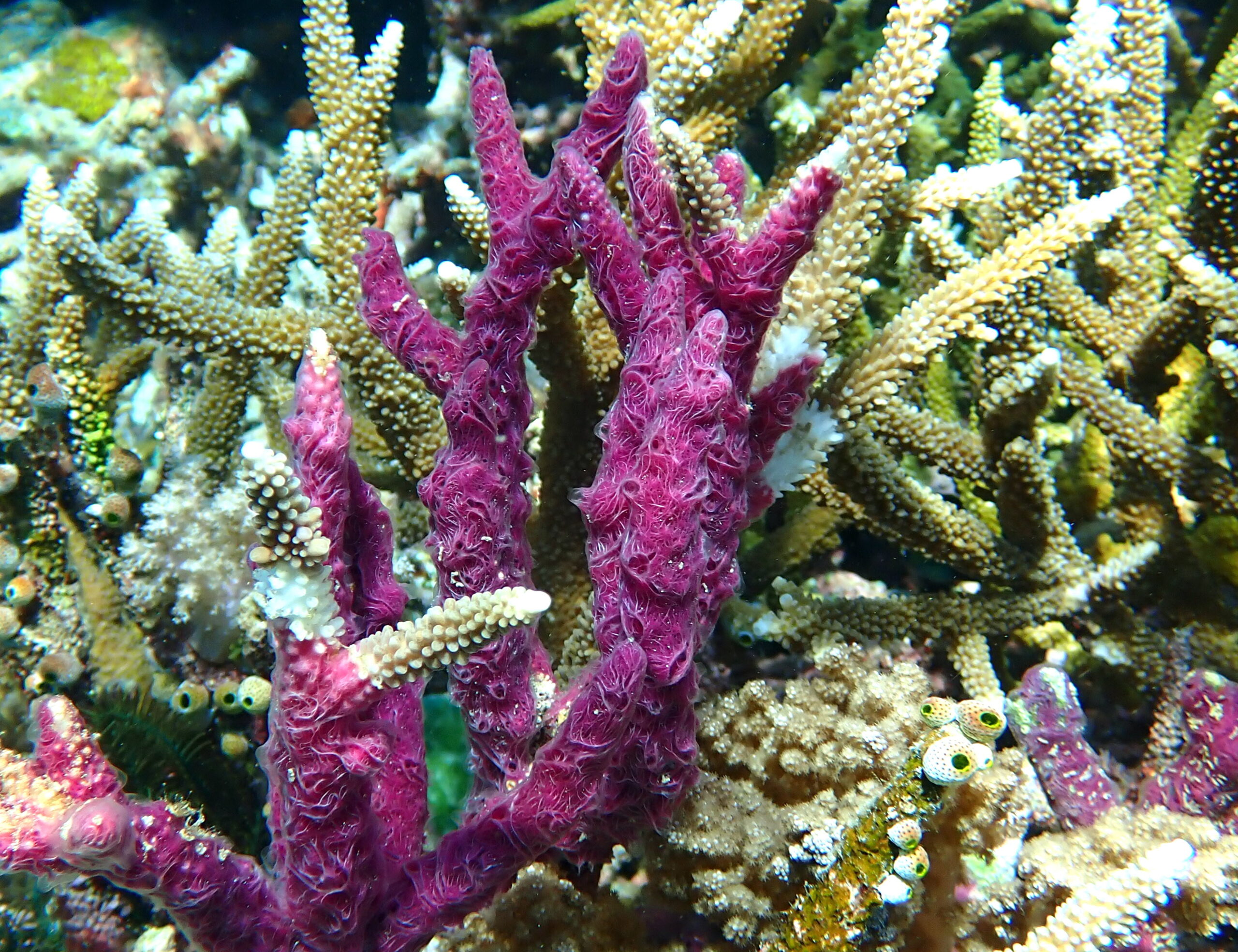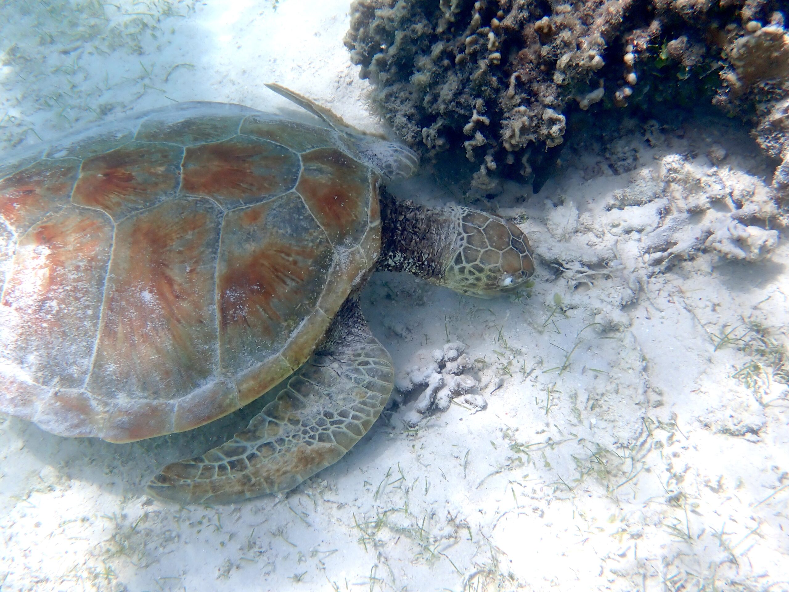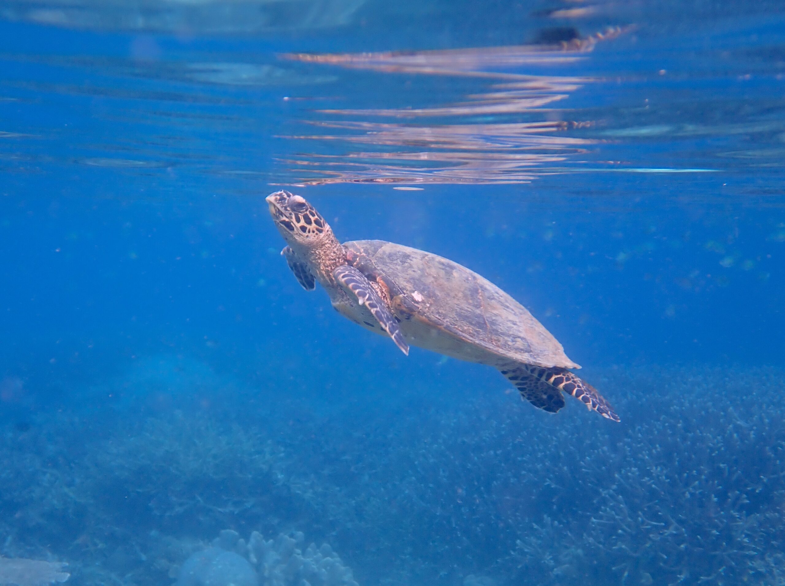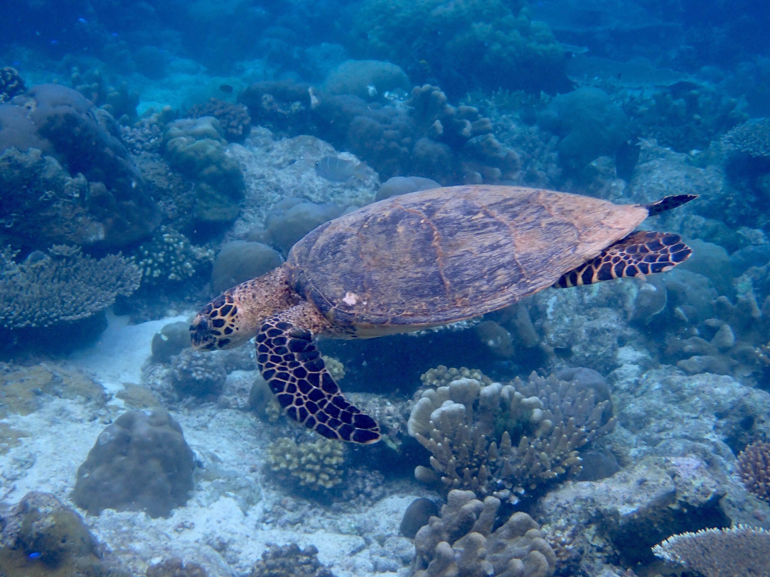 The coral habitats that can be observed while snorkelling at the resort include; extensive areas of branching Acropora, large boulder Porites and patches of Montipora/Echinopora spp. Several patches of the Octocoral, Heliopora (Blue Coral) may also be found in the North Lagoon. Areas in the shallow waters comprise silty sands, often with associated seagrasses, which attract the Hawksbill Turtle. It is possible to see small Seahorses, as well as one of the walking sharks, the Raja Epaulette Shark. The main channel comprises bedrock, soft coral and hard corals, with numerous Featherstars. This channel area also has the Jetty which has attracted a variety of colourful soft corals. An interesting feature in South Beach is a deep water Blue Hole, which is home to many large shoaling species. A few areas of degraded coral are evident, generally off the South Beach but these are being compensated for by new introductions of coral species on the banks of the Blue Hole.