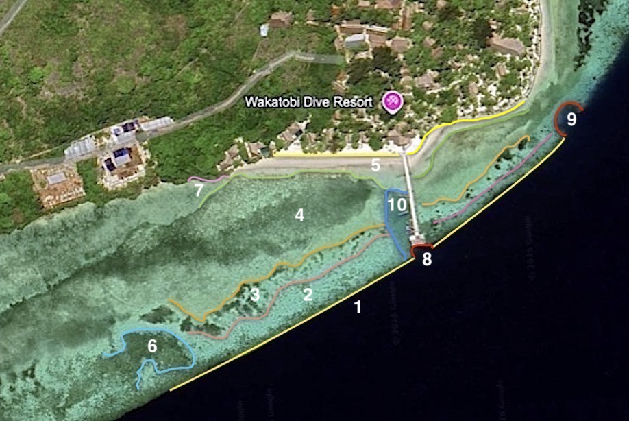 Different habitats and features noted include 1) reef edge, 2) scattered hard and soft coral, 3) mixed corals and seagrasses, 4) mixed seagrasses and algae, 5) sand, 6) a coherent patch of shallow water hard coral, 7) shallow water flat rock, 8) modified seabed at end of the jetty, 9) a large canyon within the reef, and 10) the disrupted seabed where the vessels come alongside.
